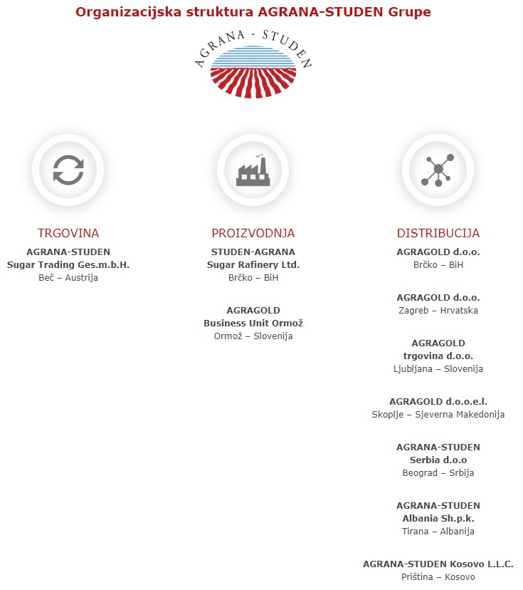 AGRANA-STUDEN Grupa se sastoji od deset operativnih joint venture kompanija osnovanih od strane AGRANA Grupe i STUDEN Holdinga, koje su odgovorne za trgovinu, preradu i distribuciju šećera i zaslađivača u svim oblicima i formama. Ovo strateško partnerstvo omogućava da AGRANA-STUDEN Grupa bude omiljeni snabdjevač kristalnog šećera u jugoistočnoj Europi.
